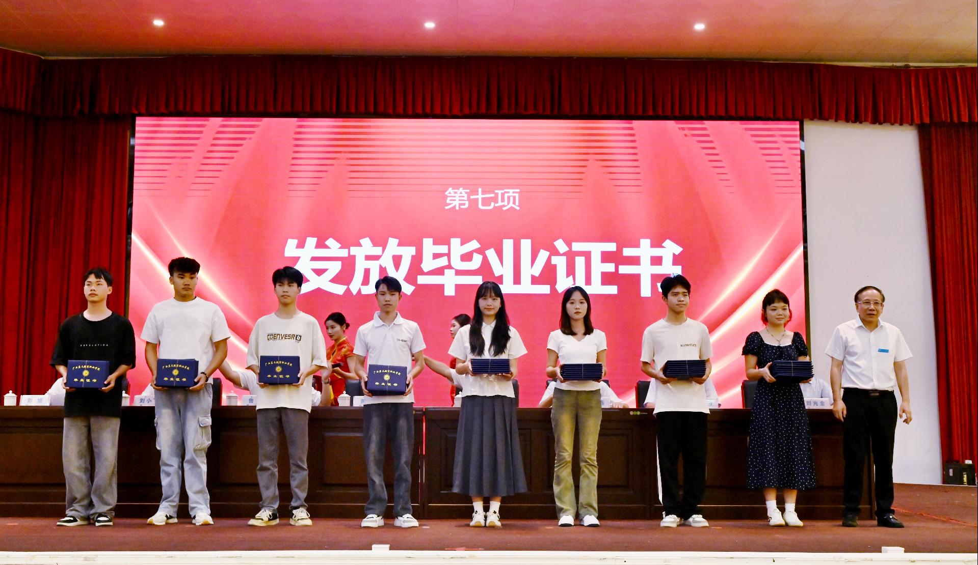 黄伟校长代表学校向全体毕业生送上美好祝福,向辛勤付出的教职工和关心支持学校发展的家长、校友以及社会各界人士致以感谢。在毕业生即将启程远航之际,他送上三句临别赠言:第一,以“蓝天精神”筑梦,永葆赤子之心。无论未来你们翱翔于万米高空,还是深耕于航空产业链的每一个环节,希望你们始终铭记选择航空事业的初心,以精益求精的工匠精神,为国家各项事业的腾飞贡献力量。第二,以“硬核技能”立业,勇立时代潮头。在高端制造、智慧民航、低空经济蓬勃发展的今天,希望你们保持终身学习的习惯,紧跟技术变革的步伐,将学校所教的无人机操控、飞机维修、航空服务等专业技能转化为职业发展的核心竞争力,成为新时代的“大国工匠”,在国家需要的每个岗位上发光发热。第三,以“八桂情怀”担当,服务壮乡发展。广西正加快建设面向东盟的航空枢纽,家乡需要你们的才华与热情。无论你们走向全国还是扎根广西,都请记住:母校永远是你们的后盾,壮乡的山海永远为你们敞开怀抱!