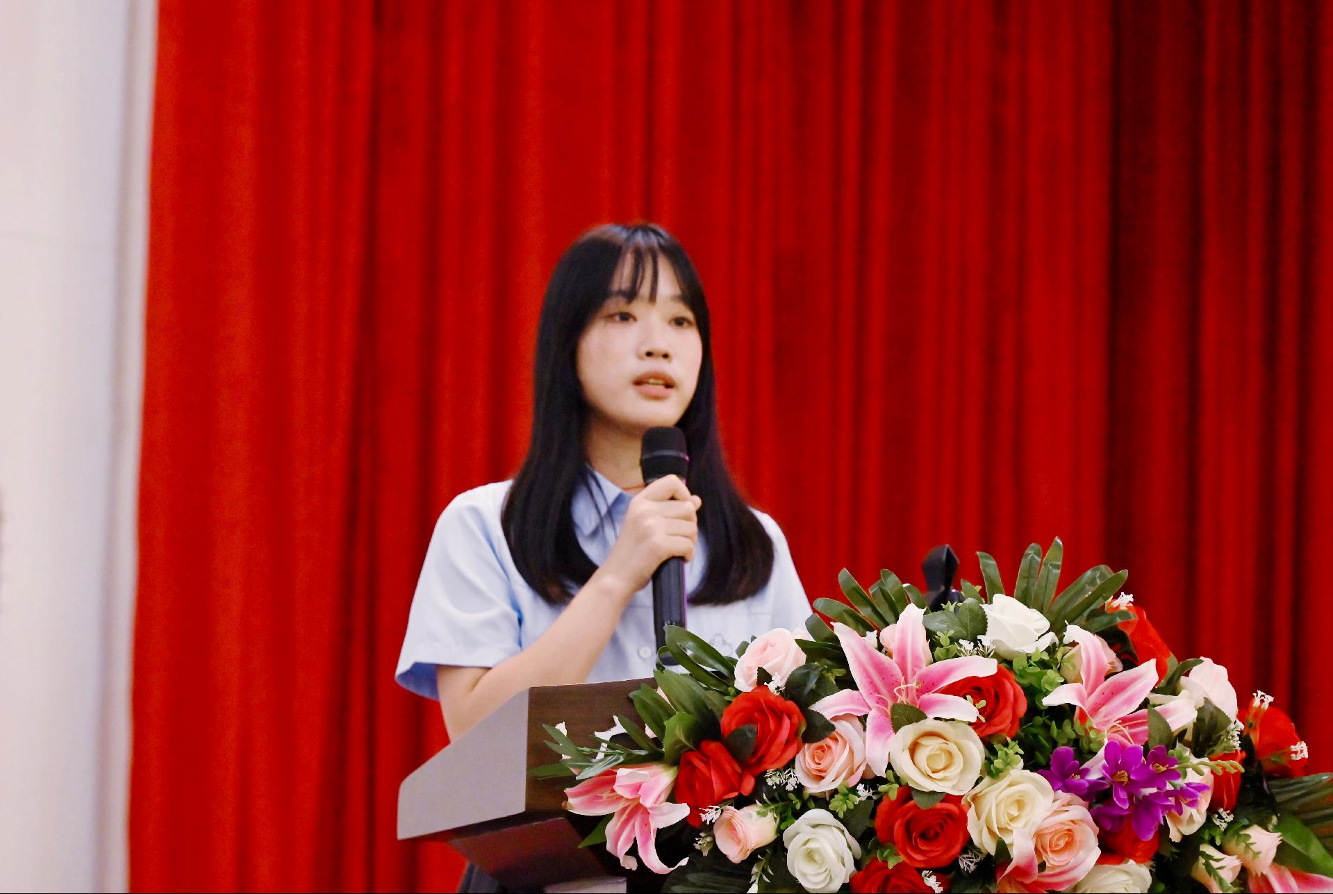 自治区优秀毕业生、航空信息技术学院莫国裕同学作为毕业生代表发言。他讲述了自己在校学习期间的收获与感悟,表达了对母校、老师、同窗的感谢之情。他表示作为新时代青年,要肩负时代赋予的使命,以青春之名,赴时代之约,在更广阔的舞台上书华丽篇章。