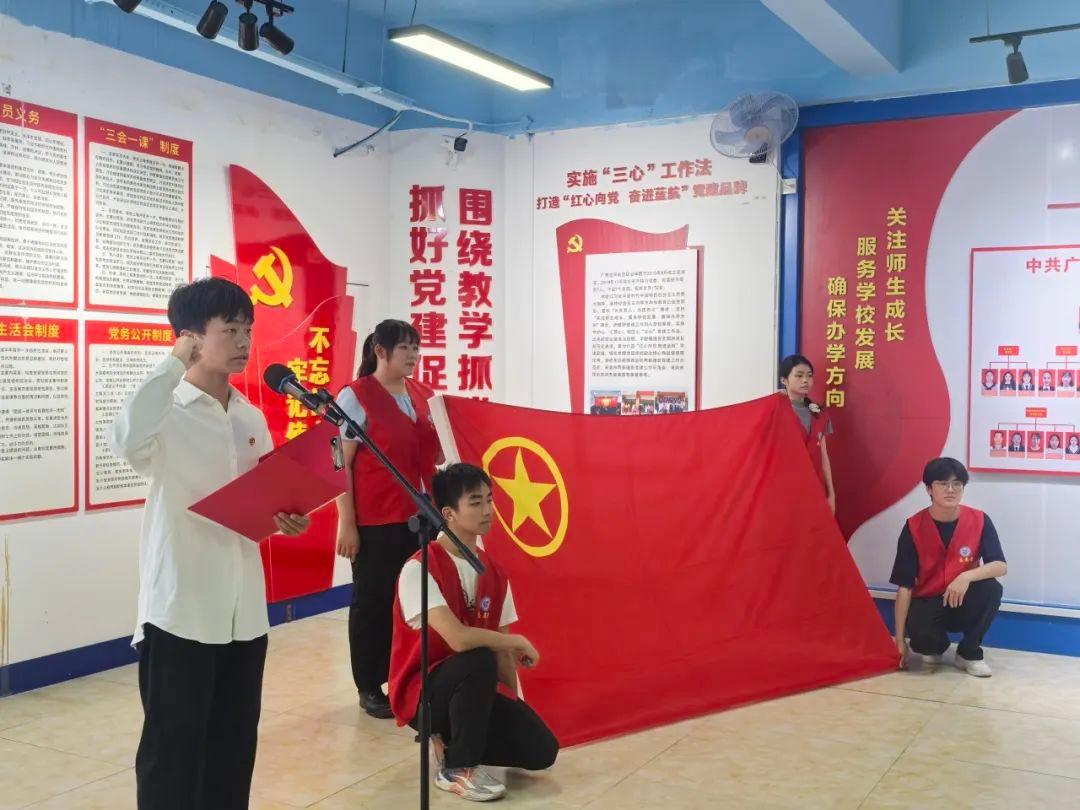 在领誓人覃添恒同学的带领下,新团员们面向团旗,高举右手,庄严宣誓。团员们声音洪亮、字字铿锵,誓言响彻会场,表达了他们加入共青团的坚定决心和对共青团组织的无限忠诚。